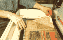 Weil beim Waschen und Anfasern aber auch der Kleister ausgeschwemmt wird, der dem Papier die Festigkeit gab, müssen die Seiten nachgeleimt werden. Das geschieht auf einer siebartigen Arbeitsfläche, durch die ein Gebläse Luft saugt. Wenn Müller nun die Papiere mit einer Bürste einkleistert, dringt der Kleber ins Papier ein und gibt ihm neue Festigkeit. Anschließend werden die Seiten zwischen stark saugenden Pappen getrocknet. Nach dreimaligem Wechsel der Zwischenlagen sind die Blätter nach etwas vier Stunden wieder trocken - rasch genug, um erneutes Schimmeln oder Wasserflecke zu verhindern. Der Rest ist Fleißarbeit: Die Bücher werden neu geheftet und wieder in die restaurierten Deckel eingebunden.